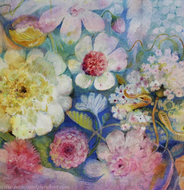 This painting, “Touched by an Angel,” is the latest in a series of three floral watercolors I’ve created for the Finnish Painters’ Union’s art sales event. I will also have two oil paintings available there, but the three watercolors were also an effort because they have a lot of details.
