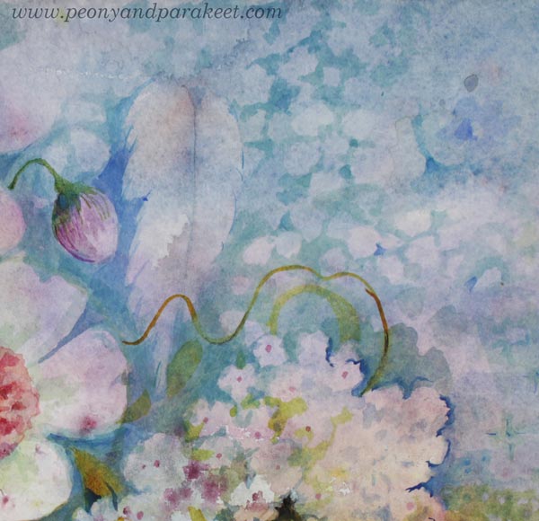Once that “mess” has dried, the real work begins. I start with the background, and the flowers slowly find their shape.